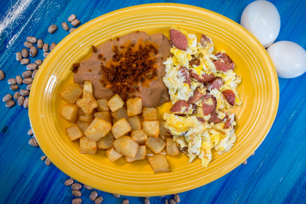 Served with breakfast potatoes, refried beans, and tortillas